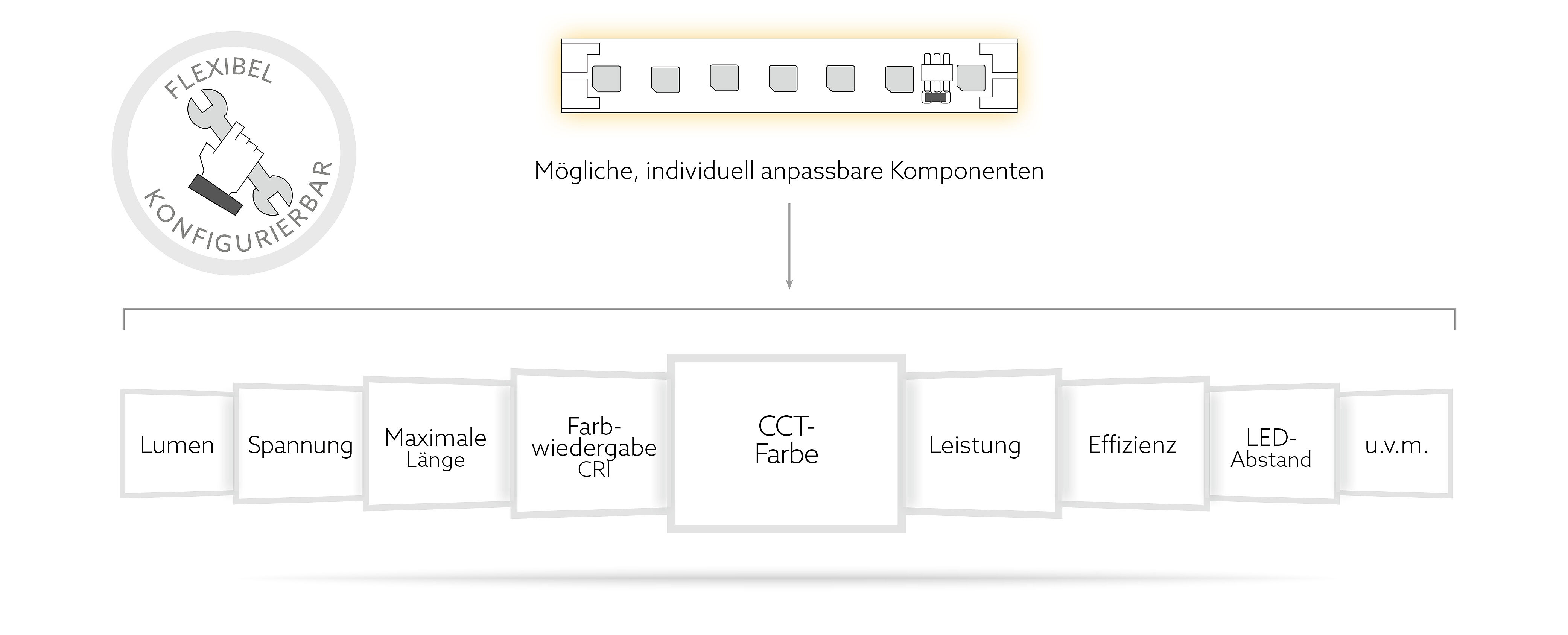 Weiß ist nicht gleich Weiß. Zur Unterscheidung wird die Farbtemperatur in Kelvin (K) verwendet. Als Referenz im Wohnbereich gilt das warm-weiße Licht einer Glühbirne (ca. 2.700 bis 2.800 Kelvin). Je höher der Wert ist, desto kälter wird das Licht empfunden. Das natürliche Tageslicht verläuft von 3.200 K bei Sonnenauf- und -untergang bis 6.500 K bei Sonnenhöchststand. „Tuneabel white“-LED-Bänder können diesen Tageslichtverlauf nachempfinden. Durch individuelle Phosphorschichten auf den LED-Chips lässt sich sogar die Farbe des abgestrahlten Lichtes nach Kundenwünschen gestalten.