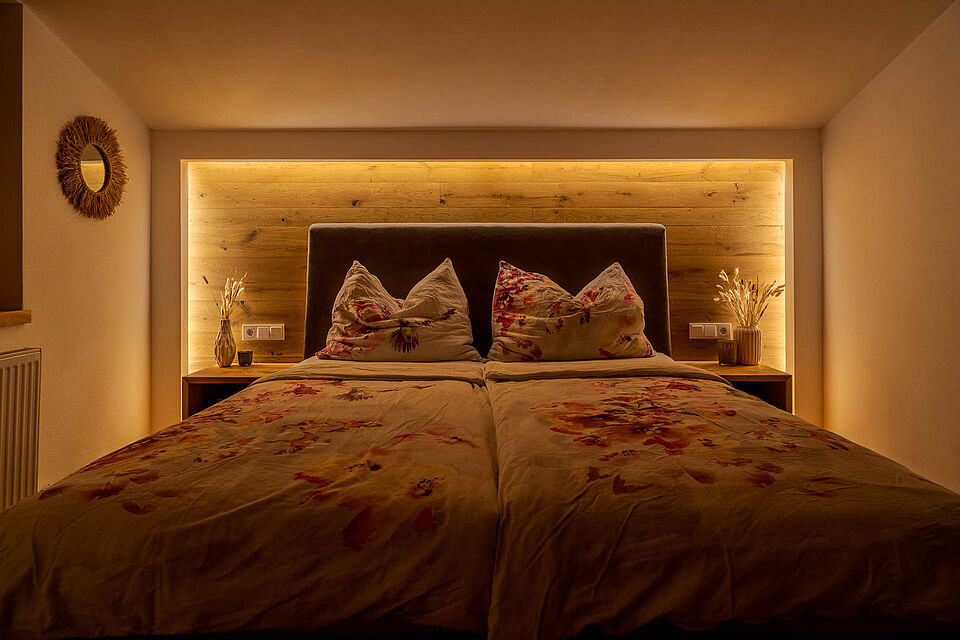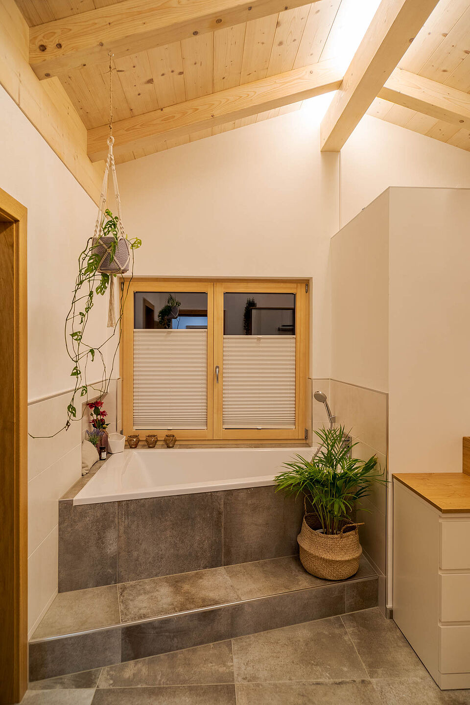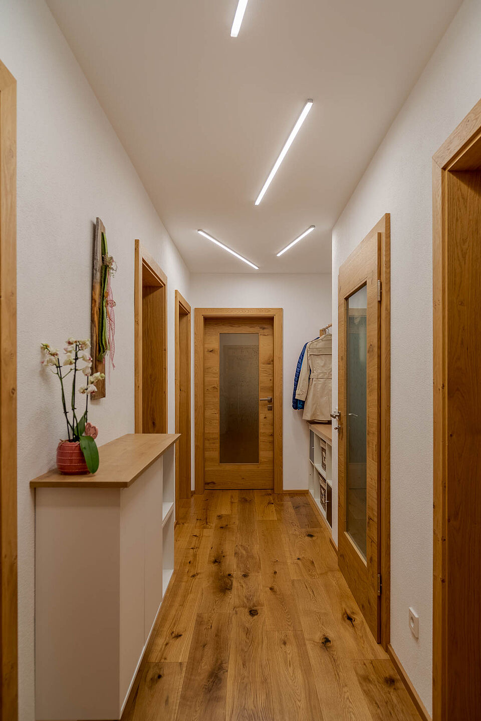 Für die Holztram im Badezimmer wurde ein BILTON TWO mit 12 Volt in der Schutzart IPX6 im Einbauprofil CT01 verwendet. Im Vorraum kam ein BILTON ONE 1300 im Aufbauprofil XT02 zum Einsatz. Und das Schlafzimmer wird in einem warmen Licht mit 2.700 Kelvin von einem BILTON ONE 900 beleuchtet.