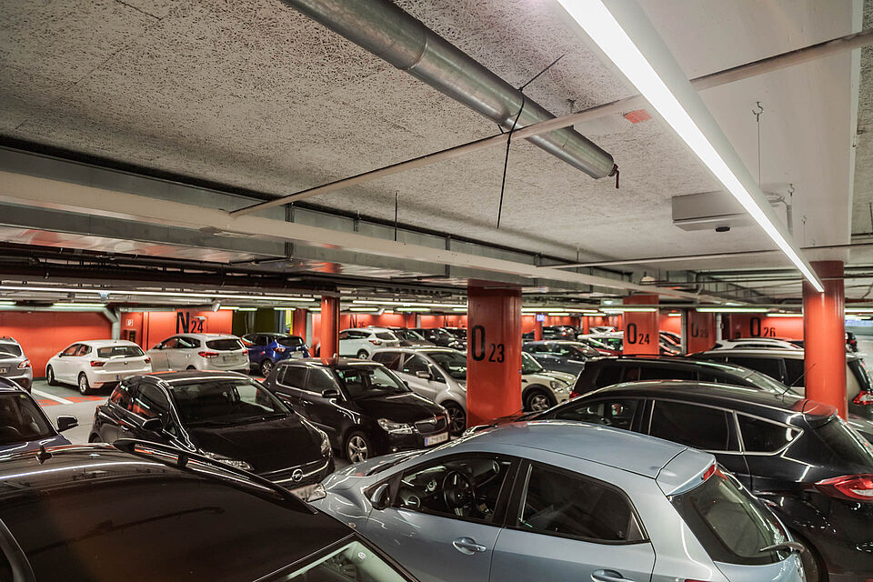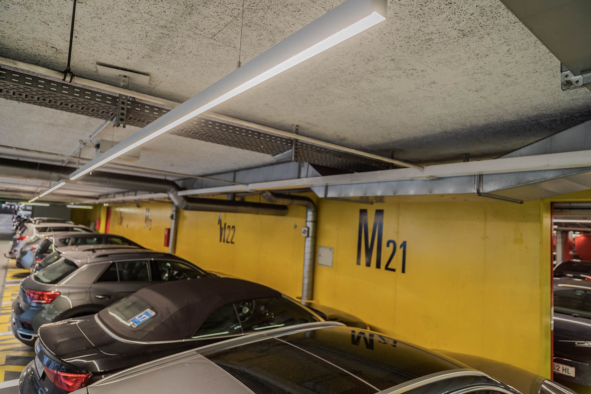 Im Zuge von Umbauarbeiten wurde BLTechnology ausgewählt, einen großen Teil dieser Parkfläche (Tiefgarage) mit speziell für diesen Kunden konzipierten LED-Leuchten auszustatten. Nach einer intensiven Entwicklungsphase haben zwei verschiedene Leuchtentypen die Entscheidungsträger überzeugt. Es wurden ca. 1.040 Leuchten verbaut - dabei wurden rund 4,1 km Profil und 8,2 km LED-Lichtbänder verbaut. Als Ergänzung wurden ca. 150 – 160 Stück, bestehend aus 400 m Profil und LED-Module installiert. Durch das gewonnen Know-How auf dem Gebiet der Tiefgaragenbeleuchtung, sieht sich BLTechnology in der Lage die neu entwickelten Leuchten, in leichten Abwandlungen nach Kundenwunsch, auch in anderen Tiefgaragen einzusetzen.