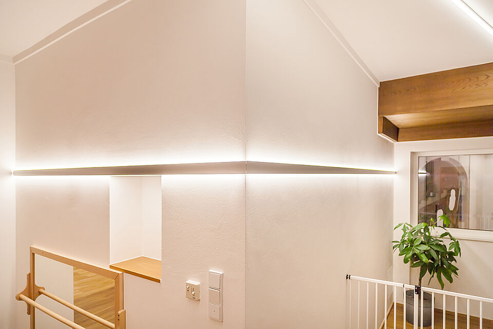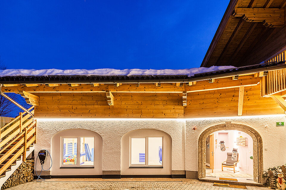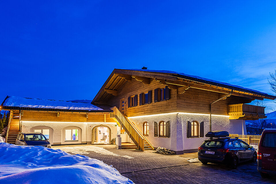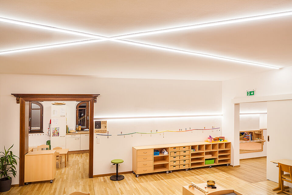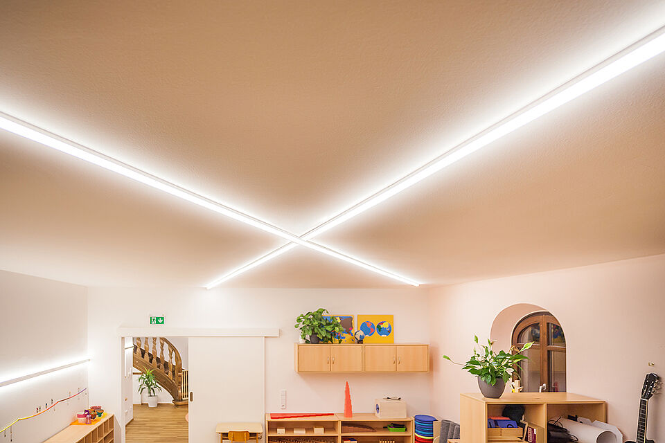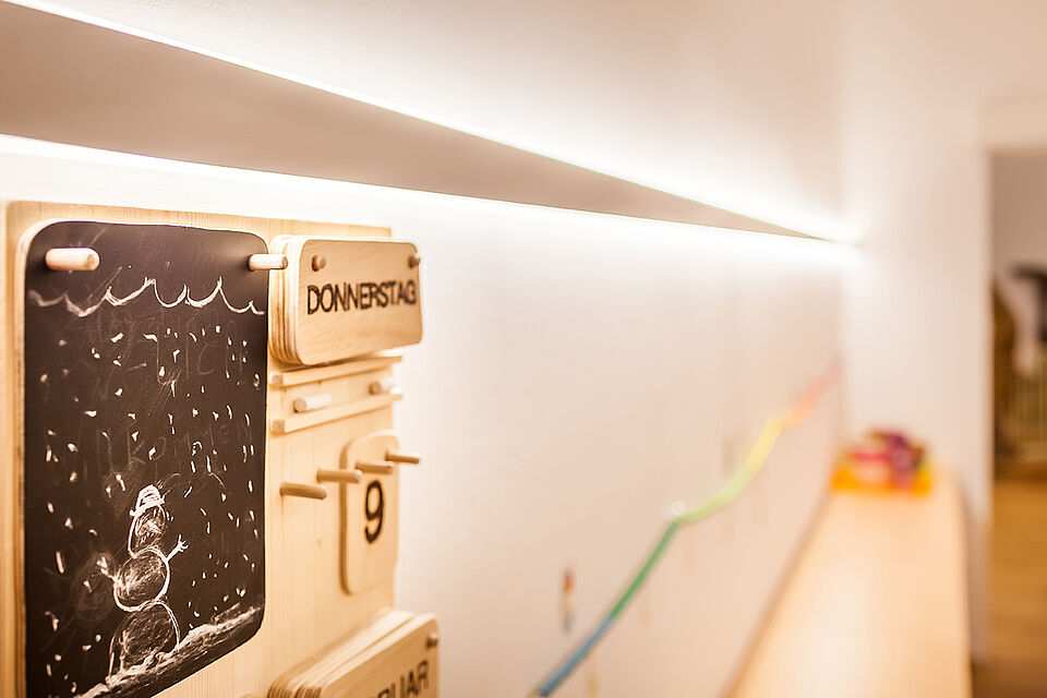 Inmitten einer der schönsten Flecken Saalfeldens steht die Villa Sonnberg. Umgeben von über 1.800 m2 Garten bietet das große, neu renovierte Haus mit seinen hellen Räumen viel Freiraum für Kinder. Die Villa ist vom Außenbereich bis in den Innenbereich mit linearer LED-Beleuchtung ausgestattet. Sowohl die geräumige Garderobe als auch der kindgerechte Sanitärbereich, die Gruppenräume, die Küche, die Büros und der Eingangsbereich erstrahlen in weißem Licht. Alles in hochwertiger Ausführung – Standard für die Montessori-Kinderbetreuung. So fühlen sich die Kinder wie zu Hause und können ihre Persönlichkeit entfalten.