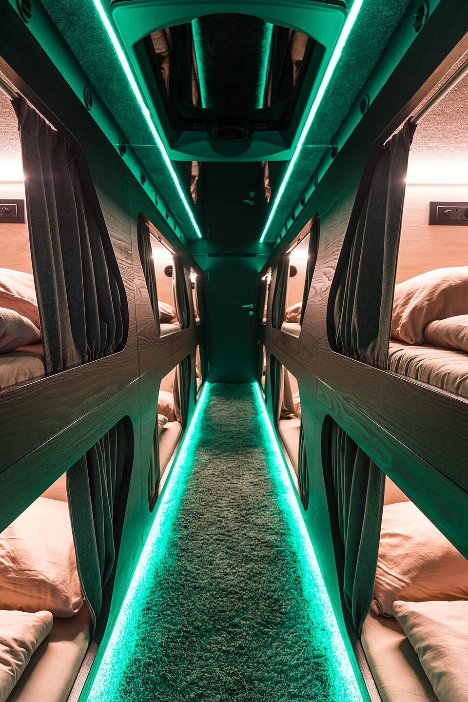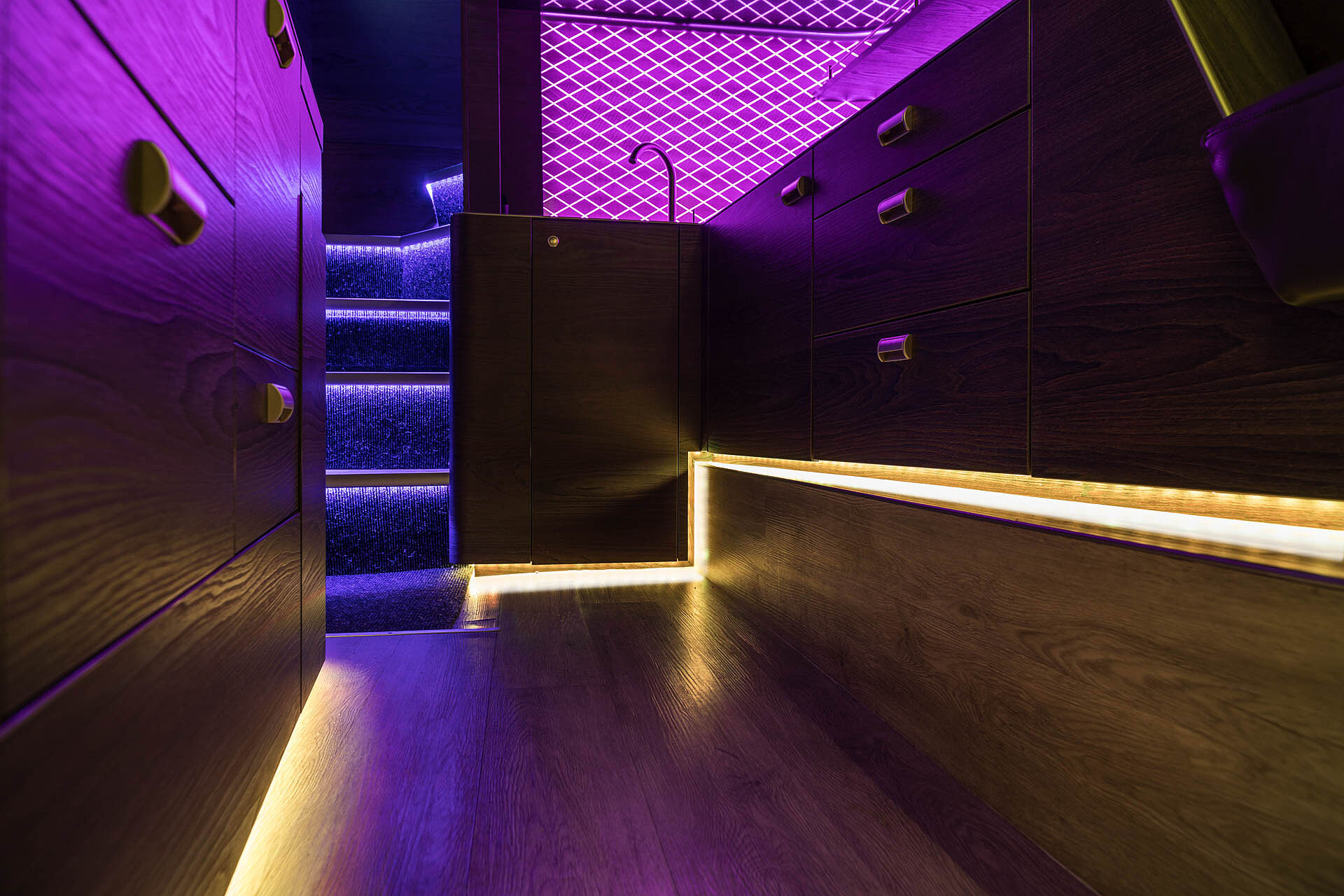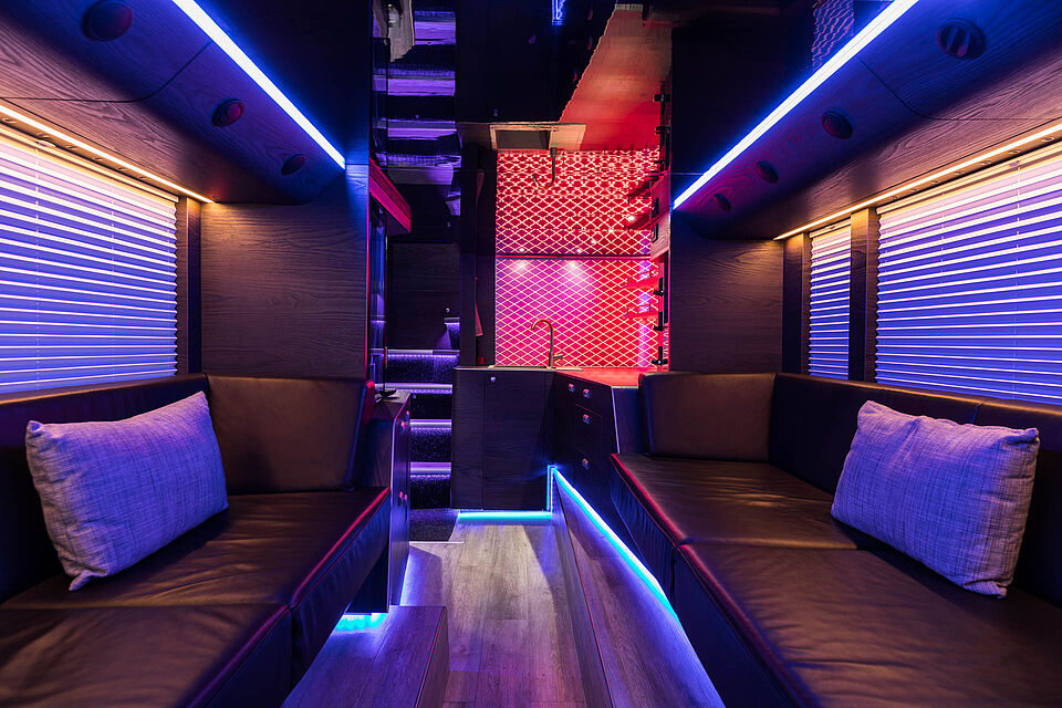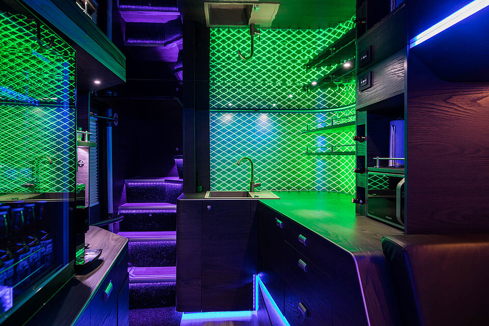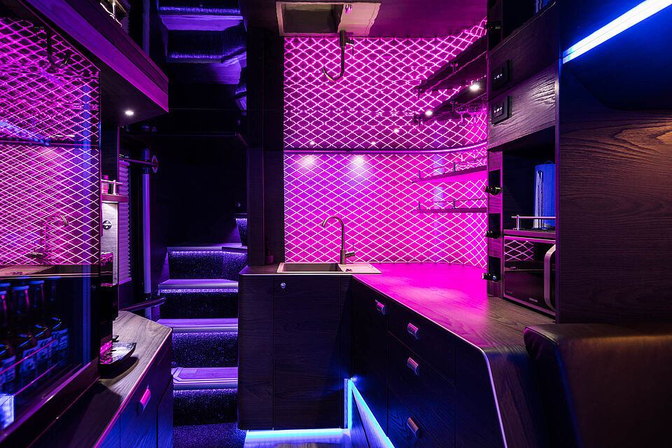 Allein die Liste der Kunden liest sich wie das „Who-is-Who“ der internationalen Musik- szene. Von Aerosmith und Alice Cooper über die Fantastischen Vier und die EAV bis hin zu den Red Hot Chili Peppers und Wiz Khalifa chauffiert „Zeppelin Nightliners“ echte Stars in Tourbussen der Extraklasse. Qualität ist hier das Stichwort, das über- zeugt. Deshalb setzt man bei der Innenbeleuchtung jetzt auf lineare LED-Lösungen von BLTechnology. So sorgen die seitlichen Streifen in Warmweiß aus der Serie BL ONE 2000 für die angemessene Grundstimmung, die den Reisenden gebührt. Und auch im Badezimmer setzt BLTechnology Akzente. Über die Nischenbeleuchtung in den eigenen YT-Profilen mit satinierten Abdeckungen. Betrieben werden die Streifen direkt über das 24-V-Bordnetz mit Spannungsstabi- lisierung. Also genauso autark, wie die Stars in ihrer persönlichen Umgebung sein möchten. Da sind wir doch ein ganz klein wenig stolz, dass die internationale Musik- und Showszene im österreichischen Licht steht. Zumindest abseits der Bühne