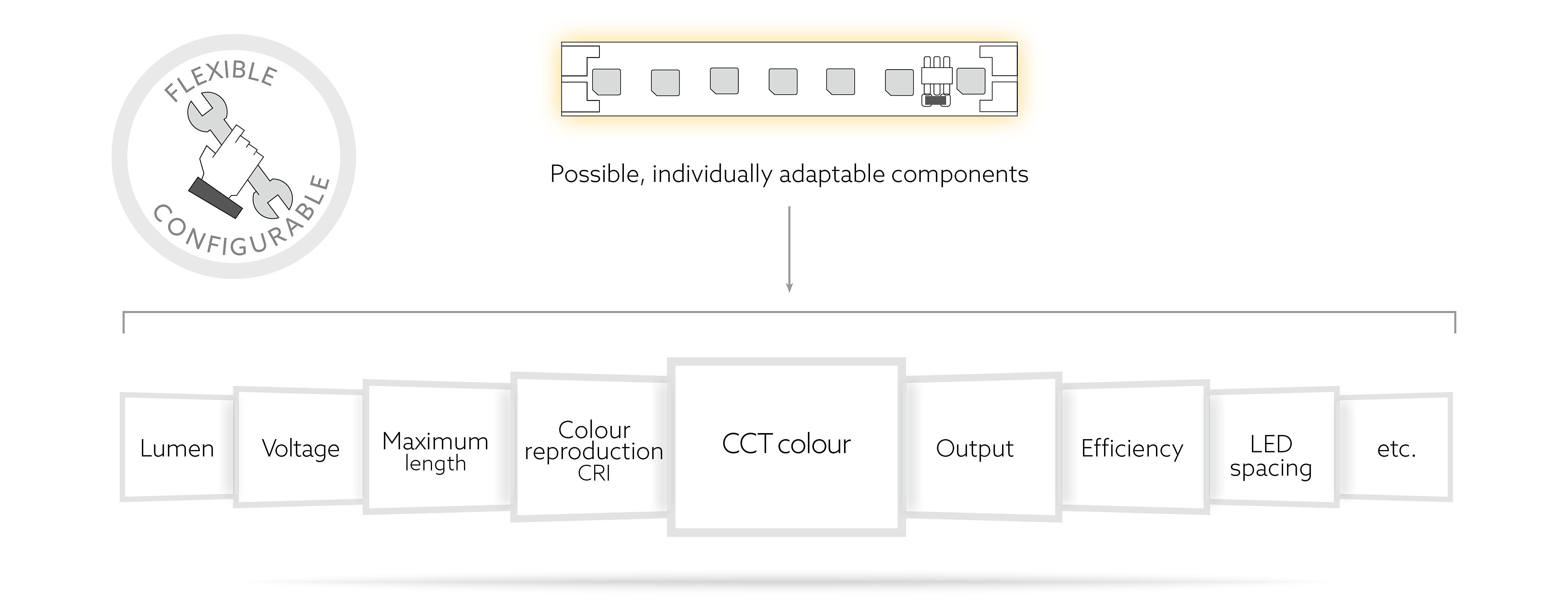White does not equal white. To distinguish differences, colour temperature is measured in Kelvin (K). The reference in domestic use is the warm-white light of a light bulb (approx. 2,700 to 2,800 Kelvin). The higher the value, the colder the light is perceived. Natural daylight ranges from 3,200 K at sunrise and sunset to 6,500 K at the sun's highest point. “Tunable white” LED strips can imitate this daylight process. Through individual phosphor layers on the LED chips, even the colour of the radiated light can be designed according to customer requirements